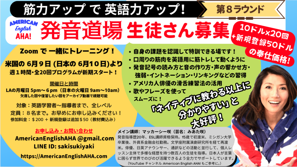 ただいま、アメリカン発音アカデミー(AHA) 発音道場では、次ラウンドの参加者を募集しています。
