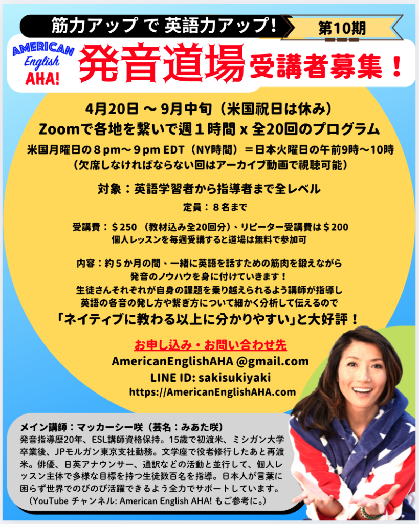 ただいま、アメリカン発音アカデミー(AHA) 発音道場では、次の20回セットの参加者を募集しています。
